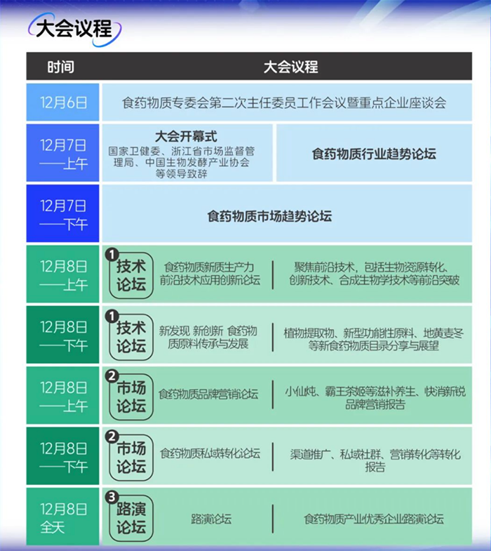 近年來,隨著法規(guī)政策的逐步完善及消費市場的快速增長,食藥物質(zhì)行業(yè)的發(fā)展進入新階段。此次大會將通過深度討論與實際案例分享,為行業(yè)提供創(chuàng)新方向與市場實踐的指導(dǎo)。大會為期三天,特邀浙江省食品安全專家委員會主任委員盧永福作重要致辭,并擬邀數(shù)位中國工程院院士、中國生物發(fā)酵產(chǎn)業(yè)協(xié)會領(lǐng)導(dǎo)、中醫(yī)藥、食品科學、公共衛(wèi)生等領(lǐng)域?qū)<夜餐鱿?span>預(yù)計吸引超過400名來自食藥物質(zhì)理事單位、品牌企業(yè)、科研院校及上下游合作伙伴的參會代表,涵蓋華熙生物、飛鶴、五個女博士、北京同仁堂、修正藥業(yè)等知名企業(yè),力圖通過內(nèi)容豐富的主題報告、行業(yè)論壇、品牌營銷實戰(zhàn)等環(huán)節(jié),搭建起一個多維度、全方位的交流平臺。