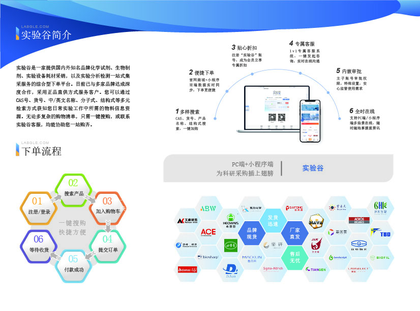 實(shí)驗(yàn)谷是一家提供國(guó)內(nèi)外品化學(xué)試劑、生物產(chǎn)品、實(shí)驗(yàn)室設(shè)備耗材采銷及實(shí)驗(yàn)分析檢測(cè)服務(wù)的一站式綜合型平臺(tái)。目前已與國(guó)內(nèi)外眾多品達(dá)成長(zhǎng)期深度合作關(guān)系,采用zheng品直供方式服務(wù)客戶。 在實(shí)驗(yàn)谷平臺(tái)上,可以通過(guò)CAS號(hào)、貨號(hào)、中/英文名稱、分子式、結(jié)構(gòu)式等多種方式檢索日常實(shí)驗(yàn)工作中所需的貨品信息資源以及平臺(tái)供應(yīng)商信息(化工廠、試劑公司、化工企業(yè)、供求信息、價(jià)格等)。無(wú)論您是科研/學(xué)術(shù)研究人員、實(shí)驗(yàn)室,還是教育機(jī)構(gòu),實(shí)驗(yàn)谷都能滿足您的實(shí)驗(yàn)需求。