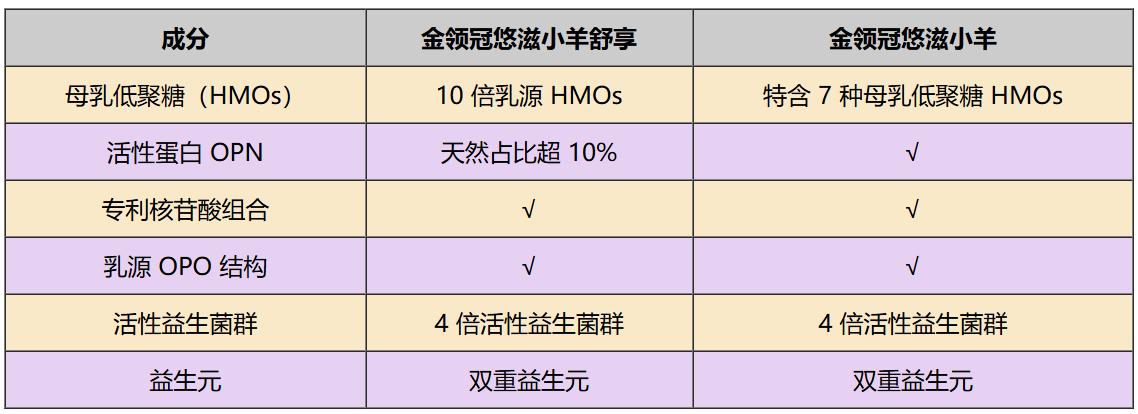 配方:科學(xué)配比,打造全方位成長(zhǎng)守護(hù) 在配方創(chuàng)新方面,兩款產(chǎn)品各具特色。金領(lǐng)冠悠滋小羊舒享以母乳研究為藍(lán)本,含有10倍[8]乳源HMOs[9](母乳低聚糖),能有效激發(fā)寶寶免疫球蛋白sIgA倍增,構(gòu)建腸道防御屏障,減少病菌感染風(fēng)險(xiǎn)。值得一提的是,金領(lǐng)冠悠滋小羊舒享中的乳鐵蛋白純度高達(dá)95%[10],能有效激活防護(hù)細(xì)胞,減少呼吸系統(tǒng)不適和肚肚不適,成為寶寶的保護(hù)力“外掛”。金領(lǐng)冠悠滋小羊則特含7種母乳低聚糖HMOs,幫助腸道降低有害菌黏附,守護(hù)腸道健康。 此外,活性蛋白OPN[11]與專(zhuān)利核苷酸組合[12]的加入,進(jìn)一步強(qiáng)化了產(chǎn)品配方的協(xié)同效應(yīng)。OPN作為初乳核心免疫蛋白,天然占比超10%[13],與乳鐵蛋白形成“雙活性CP”,協(xié)同提升寶寶自護(hù)力,讓營(yíng)養(yǎng)吸收更高效。 對(duì)于新生兒來(lái)說(shuō),腸胃功能尚未發(fā)育完全,消化系統(tǒng)較為脆弱,因此許多寶寶在成長(zhǎng)初期容易出現(xiàn)消化不適的癥狀,如脹氣、便秘或腹瀉等。針對(duì)這一常見(jiàn)問(wèn)題,金領(lǐng)冠悠滋小羊舒享和金領(lǐng)冠悠滋小羊都進(jìn)行了精心的配方設(shè)計(jì):科學(xué)配比乳源OPO結(jié)構(gòu)脂、4倍[14]活性益生菌群以及雙重[15]益生元黃金組合,這些成分相互協(xié)同,能夠有效調(diào)節(jié)腸道菌群,促進(jìn)營(yíng)養(yǎng)吸收,減少寶寶腸胃不適,讓寶寶的小肚肚更舒適,助力健康成長(zhǎng)。