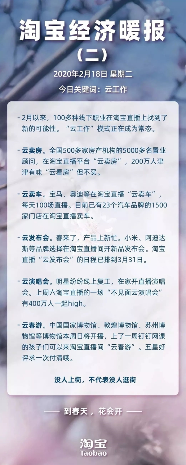 其中,淘寶直播在這次疫情寒冬之中,創(chuàng)新了很多玩法,給線下很多職業(yè)提供了新的上班方式。如導(dǎo)購(gòu)直播賣貨、云賣房、云賣車、云發(fā)布會(huì)、云演唱會(huì)等等,在諸多企業(yè)停業(yè),損失慘重之際,淘寶直播提供了新的解決方案。 1、疫情寒冬,淘寶直播卻一路狂奔 2019年,一句話術(shù)“買它、買它、買它”,讓李佳琦徹底火了,也給整個(gè)淘寶直播生態(tài)起到了帶動(dòng)作用和口碑效應(yīng),讓更多的賣家參與到直播中來(lái),從而為淘寶直播創(chuàng)造更高的業(yè)績(jī)。 不過(guò),直播中最火的還是美妝、零售、衣服等產(chǎn)品,而一些需要依靠線下場(chǎng)景的行業(yè),基本沒(méi)怎么涉及到直播。如今,疫情爆發(fā),全民宅家,一些創(chuàng)新玩法,讓我們看到了淘寶直播的更多可能。 云賣房:200萬(wàn)人圍觀 從1月到2月,短短39天時(shí)間,有95家房企破產(chǎn)。疫情給房地產(chǎn)行業(yè)帶來(lái)了巨大的損失,沒(méi)有資金回流,銀行貸款、員工等等高昂成本,壓垮了一些中小房企。