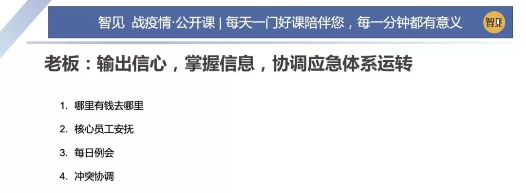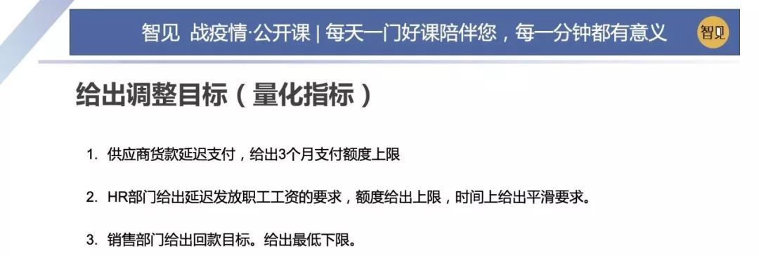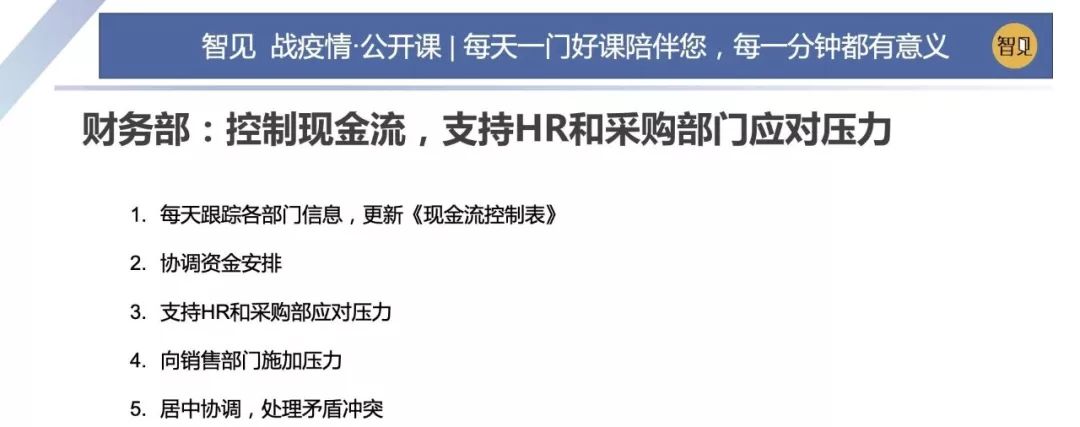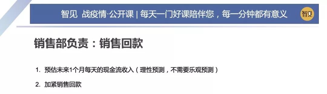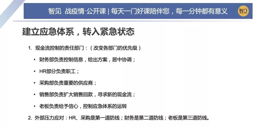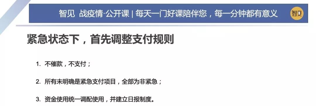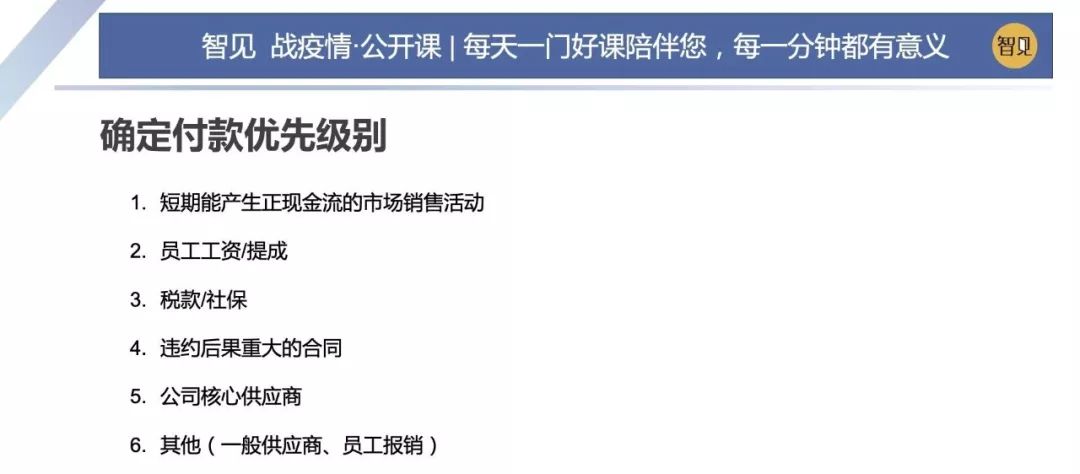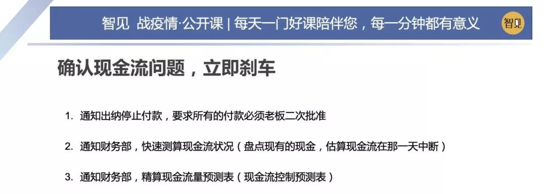 因為這場突如其來的疫情,這兩天西貝集團董事長賈國龍在接受采訪時說,西貝的現(xiàn)金流最多能撐 3 個月。老鄉(xiāng)雞董事長束從軒、九毛九集團董事長管毅宏等一些餐飲業(yè)大佬也表示,他們的餐飲企業(yè)現(xiàn)金流最多能撐 1 個半月。恒大研究院院長任澤平指出,受疫情影響,餐飲、旅游、電影、交運、教育培訓等行業(yè)沖擊最大,僅春節(jié) 7 天時間簡單估算的損失,電影票房 70 億(市場預測)+餐飲零售 5000 億(假設腰斬)+旅游市場 5000 億(完全凍結),這三個行業(yè)直接經(jīng)濟損失已經(jīng)超過 1 萬億。 這幾天國內(nèi)眾多的投資機構的負責人,也紛紛給自己的被投企業(yè)打電話,詢問企業(yè)的現(xiàn)金流如何?可見,疫情對于企業(yè)經(jīng)營的影響是非常直接而深遠的。 面對疫情,現(xiàn)金流無疑是企業(yè)生存之本。本期「智見 戰(zhàn)疫情·公開課」請到了智見財稅合伙人傅旭東老師為大家?guī)矸窒恚簯睜顟B(tài)下的現(xiàn)金流管理 緊急狀態(tài)下的現(xiàn)金流管理 面對疫情,現(xiàn)金流無疑是企業(yè)生存之本。本期「智見 戰(zhàn)疫情·公開課」請到了智見財稅合伙人傅旭東老師為大家?guī)矸窒恚簯睜顟B(tài)下的現(xiàn)金流管理 「傅旭東:上海稅務師事務所合伙人,注冊會計師、注冊稅務師,22年財稅工作經(jīng)歷,是上海市政府特聘服務企業(yè)的財稅專家,長期擔任上市公司風控管理人」 今年疫情對絕大多數(shù)的企業(yè)都產(chǎn)生了重大的影響,我們企業(yè)家要想辦法自救,活下來,轉危為機。企業(yè)活下來,最核心條件是現(xiàn)金流。
