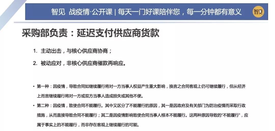 采購部的主要任務就是要跟所有的供應商談判,然后延遲支付供應商的貨款。對主要的供應商,我們要進行主動出擊。何為主要供應商?如果供應商不發(fā),或者不支持我們的話,生產(chǎn)經(jīng)營就可以可能中斷。這叫做主要供應商。 在這次疫情情況下,建議要早一點跟供應商進行協(xié)商,協(xié)商越早越可能獲得更大的延期支付空間。 我們一般與供應商都是共生關系,溝通成功的可能性還是很高的。為了保證采購部的成功率,財務總監(jiān)可以一起向客戶作出一些承諾和保證。法律上有一些信息,可以給到采購部門做參考。 商業(yè)合同約定中,有一條叫不可抗力條款。條款中包括戰(zhàn)爭、地震、海嘯等,但恰恰疫情是不包括在內(nèi)的。但是2003年非典疫情期間,針對疫情產(chǎn)生的民事糾紛,最高法院曾經(jīng)出過一個指導意見。 第一種規(guī)定:因疫情導致合同繼續(xù)履行給當事人的一方權益產(chǎn)生重大影響的。換言之,就是合同客觀上可以繼續(xù)履行,但是繼續(xù)履行的話,會給一方當事人造成重大損失或者不便的。第二種就是因疫情導致合同不能履行的,這里面又區(qū)分為兩種原因,一種是政府規(guī)定,采取的行政措施,導致合同直接不能履行的;第二個是因為疫情的影響導致當事人不能履行的,這兩種情況都叫做無法繼續(xù)履行。 上述兩種情況是很好用的一個工具。具體如何運用這兩個條款,行業(yè)上有一些分析,餐飲、娛樂、金融服務、工廠、普通企業(yè)辦公等人流密集性的場所,因為疫情的原因導致?lián)p失的,都有可能會引用上述的兩個條款。 關于采購部門跟財務部門如何配合共同說服供應商延遲支付貨款,我們在2018年的案子中做了一些經(jīng)典配合。 正常情況下,一般是采購部門先去溝通,如果溝通不下來,會邀請供應商到達公司,財務部門會出面大家一起跟跟供應商開會,說服他們。在極端情況下,財務有一個工具可以使用,就叫做期票。 期票,就是普通的轉賬支票,只是開具的日期是遞延30天以后。這樣供應商拿著支票回去,他也有一個交代,同時也獲得相應的一個保證。 期票本身并不完全合規(guī),但是在現(xiàn)實中可以這樣去使用。期票開出以后要特別小心,因為它是未來一段時間才到銀行去兌付的。財務部門要把這個期票的信息要錄入到現(xiàn)金流預測表里面。防止出現(xiàn)空頭支票,這樣問題就比較嚴重了。 接下來討論如何延遲支付員工工資