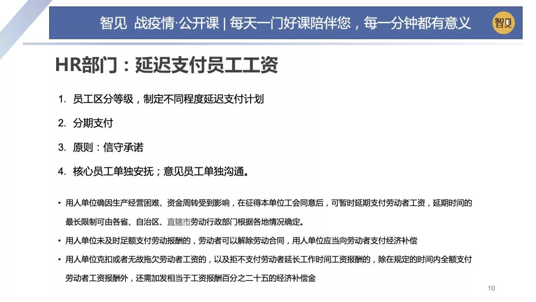 延遲支付員工工資是風險最大的一個行動,也是最讓人頭痛的一個行動。這件事處理不好就有可能讓公司分崩離析。 但是一旦做出了延遲支付員工工資的決策,就要堅決執(zhí)行。我們在2018年這個案子中,當時財務部與HR部門詳細討論了所有的方案,包括某些人哪些人會產(chǎn)生問題,都列出了詳細的應對方案。 延遲支付員工工資這個信息不能過早泄露。正常情況下是在做出這種行動,就是發(fā)放工資當日,才向員工進行平凡的一個說明。 延遲支付員工工資方案中,我們首先對員工進行分類,員工分為:經(jīng)理、區(qū)域經(jīng)理,也有主管、普通員工。那為這些員工進行等級,然后制定不同的延遲支付計劃。在2018年的時候,我們跟金總商量,所有的員工全部統(tǒng)一,每個月先行支付5000元錢。 然后要求普通員工,剩下的工資是遞延30天,主管級以上的員工工資遞延三個月以上。 對于延遲支付工資,公司一旦做出承諾,財務部門一定要信守承諾,否則員工一旦對公司失去信念的話。整個團隊就喪失了戰(zhàn)斗力。 具體在執(zhí)行的時候有很多細節(jié),但是有一個行動必須要做,就是跟部分員工的單獨談話。 公司HR要挑出核心員工,如果有可能,由老板親自出面進行安撫。除了核心員工,公司一定會存在一些意見員工,就像意見領袖一樣,那這些員工也需要進行單獨溝通。金總的公司當時HR部門,財務部門各自成了一個小組,包括副總裁在內(nèi),單獨找核心員工給和意見員工一個個進行談話溝通。 HR延遲支付工資的一個行動,核心就是要留下核心員工。然后在整個團隊中要控制消息的傳播。另外,HR部門還要預備法律風險的一些發(fā)生。在整個過程中,老板需要親力親為參與進來,特別對那個核心員工。 一旦延遲支付員工工資以后,會導致勞動部門的一些處罰,在這里我們也提供一些政策解讀,給HR部門作為一個工具。 第一:用人單位產(chǎn)生經(jīng)營困難資金周轉盈收到影響的話,工會同意可以延遲支付勞動者工資,這是合法的。具體延遲的時長由各個地方的勞動部門來制定。 第二:用人單位如果沒有及時支付勞動報酬,勞動者在極端情況下是可以解除勞動合同的。這時候按照規(guī)則,企業(yè)需要支付違約金的,這個補償金是工資報酬的25%。但是在2018年呢,我們實務中,800多人的員工確實有人投訴到勞動管理部門。但是我們跟勞動管理部門溝通完以后沒有給予公司什么處罰。 五.銷售和財務部門的分工:嚴控一進一出的計劃和執(zhí)行 銷售部門和財務部門受到壓力主要來自于內(nèi)部,有一定共性。