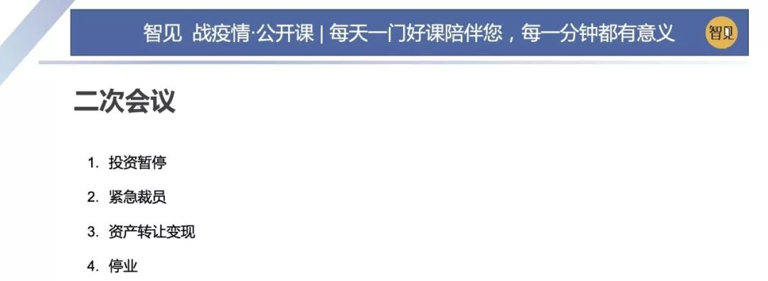 首先,投資暫停 要停止擴張計劃,停止所有需要花錢的項目。我們當時定了一個原則,就是合作方愿意延遲三個月的項目,可以進行保留;能立即產(chǎn)生現(xiàn)金流的項目可以進行保留。 投資暫停往往是一個非常痛苦的決定,因為很多項目初期已經(jīng)有成本投下去了,這時候暫停投資的話會有重大的損失。金總當時經(jīng)準備擴張幾家店,所有的押金已經(jīng)支付完畢,甚至有的已經(jīng)裝修完畢,這些項目停止給公司帶來的損失是非常巨大的,但是它帶來的好處就是及時的終止了現(xiàn)金流的損失。 第二,緊急裁員 危機對企業(yè)有利一面,是可以清理一些不重要的人員,壓縮一下各部門的成本支出。在危機的情況下,這樣大家都比較容易理解,更容易貫徹執(zhí)行下去。 第三,資產(chǎn)進行轉讓變現(xiàn) 資產(chǎn)轉讓變現(xiàn)上,老板執(zhí)行決策、執(zhí)行要快。老板要降低預期值,這樣便于快速成交,回籠資金。我覺得我們可以從王健林為解決他的現(xiàn)金流危機時所做的方法中去借鑒一些經(jīng)驗。 2018年我們?yōu)榻鹂偺幚磉^他的一些投資和門店,有些門店快速地轉讓給核心員工,有些快速轉讓給一些同行,實現(xiàn)了資產(chǎn)的快速變現(xiàn)。同時也實現(xiàn)了一些非優(yōu)質資產(chǎn)的一個剝離。 第四,停業(yè) 公司在極端情況下是可以考慮停業(yè)的,這個決策的話特別適合低端的勞動密集型企業(yè),這樣可以極大地節(jié)約人力成本。