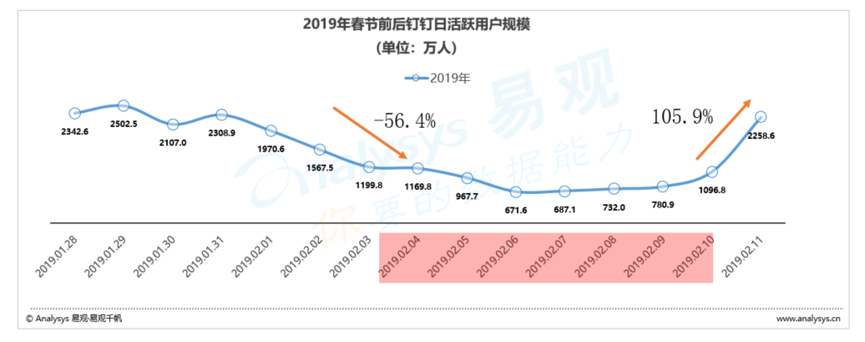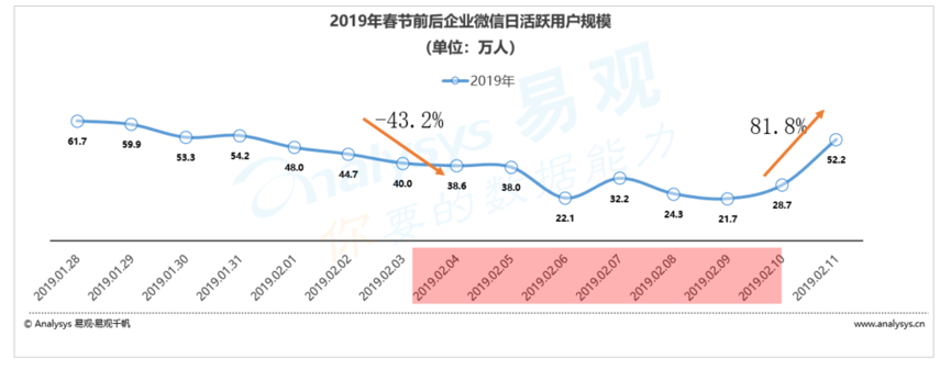 根據(jù)易觀千帆數(shù)據(jù)顯示,2019年春節(jié)前一周釘釘平均日活躍用戶為1999.8萬人,而春節(jié)假期期間平均日活躍用戶為872.3萬人,降幅達到56.4%,而節(jié)后第一天日活躍用戶猛升至2258.6萬人,較假期平均值增幅達到105.9%。同樣春節(jié)前一周企業(yè)微信平均日活躍用戶為51.7萬人,而春節(jié)假期期間平均日活躍用戶為32.2萬人,降幅達到43.2%,而節(jié)后第一天日活躍用戶猛升至52.2萬人,較假期平均值增幅達到81.8%。 在2019年的春節(jié)假期中,釘釘及企業(yè)微信出現(xiàn)了明顯的曲線變化,休假復工現(xiàn)象明顯。