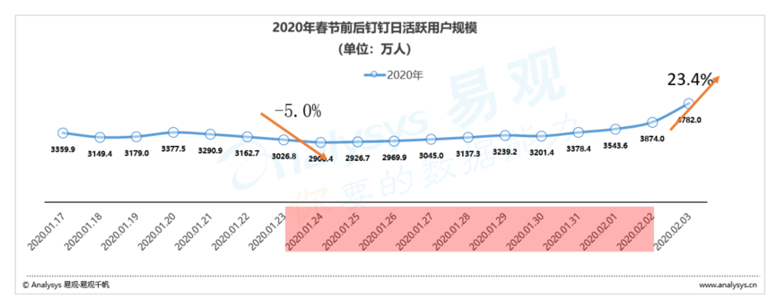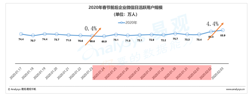 而在2020年,根據(jù)易觀千帆數(shù)據(jù)顯示,春節(jié)前一周釘釘平均日活躍用戶為3220.9萬人,而春節(jié)假期期間平均日活躍用戶為3149.1萬人,降幅為5.0%,而節(jié)后第一天釘釘日活躍用戶提升至4782.0萬人,較假期平均值增幅達到23.4%。同樣春節(jié)前一周企業(yè)微信平均日活躍用戶為72.2萬人,而春節(jié)假期期間平均日活躍用戶為72.5萬人,不降反升5.0%,而節(jié)后第一天企業(yè)微信日活躍用戶提升至83.9萬人,較假期平均值增幅達到4.4%。 2020年,釘釘及企業(yè)微信春節(jié)期間用戶并未出現(xiàn)明顯下降,因為疫情更多的人無法休假,堅持在工作第一線,同樣為了防止疫情的擴散,線上辦公成為了首選。 眾多在線辦公軟件助力企業(yè)抗疫情