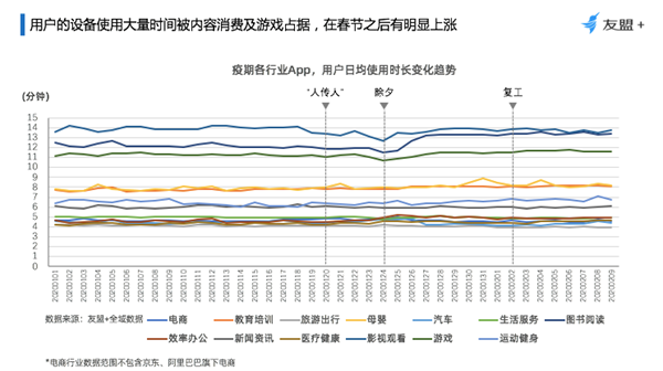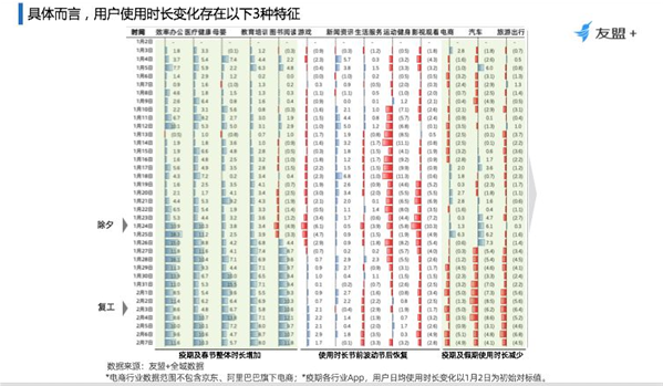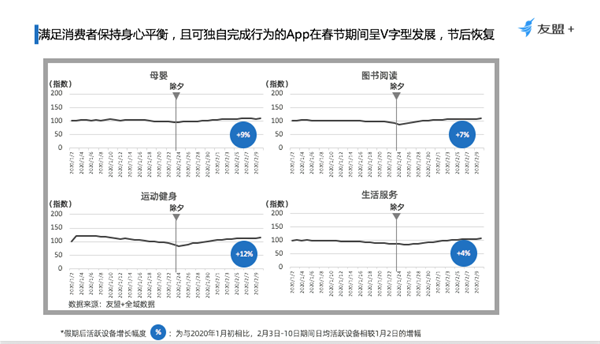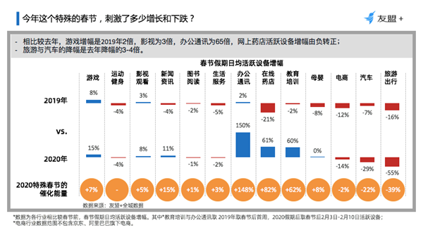 冬末春至,新年伊始,在全國人民齊心協(xié)力“抗疫”的這場特殊戰(zhàn)役中,全民需求往線上轉(zhuǎn)移,移動互聯(lián)網(wǎng)新拐點產(chǎn)生。友盟+分析了整個大盤的13個重點行業(yè),讓大家更客觀的了解今年春節(jié)以及疫情給行業(yè)帶來的影響和變化,同時也期望行業(yè)的每一位參與者能借此機會養(yǎng)精蓄銳,為明天做好準備。 幾大關(guān)鍵發(fā)現(xiàn) 1、移動互聯(lián)網(wǎng)設(shè)備活躍度穩(wěn)步提升,但由于季節(jié)性因素新增設(shè)備量減少; 2、受疫情影響,休閑、資訊與內(nèi)容消費類App活躍設(shè)備與新增設(shè)備量均保持持續(xù)增長;母嬰、社交、游戲短期內(nèi)將保持增長; 3、疫情加速移動辦公、醫(yī)療健康、以及教育培訓快速增長;推動相關(guān)領(lǐng)域資源向下線城市滲透,用戶使用時長提升; 4、內(nèi)容消費類,在春節(jié)期間保持了穩(wěn)定的活躍度,用戶使用時長也穩(wěn)步提升; 5、重線下服務(wù)的行業(yè),如旅游出行與汽車行業(yè)受重創(chuàng),短期內(nèi)無復蘇跡象; 6、生鮮電商幫助電商行業(yè)減輕了疫情的沖擊;但其表現(xiàn)受快遞物流能力抑制減弱; 7、疫期快速發(fā)展的線上藥店、教育培訓、母嬰、游戲,14日留存率表現(xiàn)相對較差; 8、武漢地區(qū)的移動互聯(lián)網(wǎng)應(yīng)用顯著變化,緩解疫情帶來的緊張氛圍與情緒類的 App新增比例顯著高于全國水平。 綜合來看,今年這個特殊的春節(jié)相較于去年,整個行業(yè)變化如下圖。其中游戲行業(yè)增幅15%,是2019年的2倍;影視增幅8%,是去年的3倍左右;辦公通訊上漲明顯,增幅150%,網(wǎng)上藥店活躍設(shè)備增幅由負轉(zhuǎn)正,增幅61%;旅游與汽車的降幅是去年的3-4倍,分別下跌55%及29%。