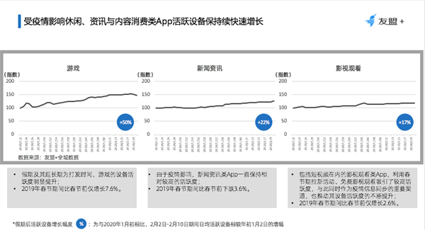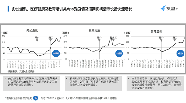 假期及其延長期為打發(fā)時間,游戲的設(shè)備活躍度明顯提升;新聞資訊類App一直保持相對較高的活躍度;包括短視頻在內(nèi)的影視觀看類App,利用春節(jié)期拉新活動、免費觀看吸引了較高活躍度,與此同時作為疫情信息同步的重要渠道,也推動其設(shè)備活躍度的不斷提升。 辦公通訊、醫(yī)療健康及教育培訓類App受疫情及假期影響活躍設(shè)備快速增長